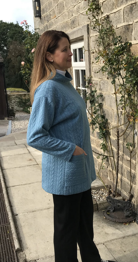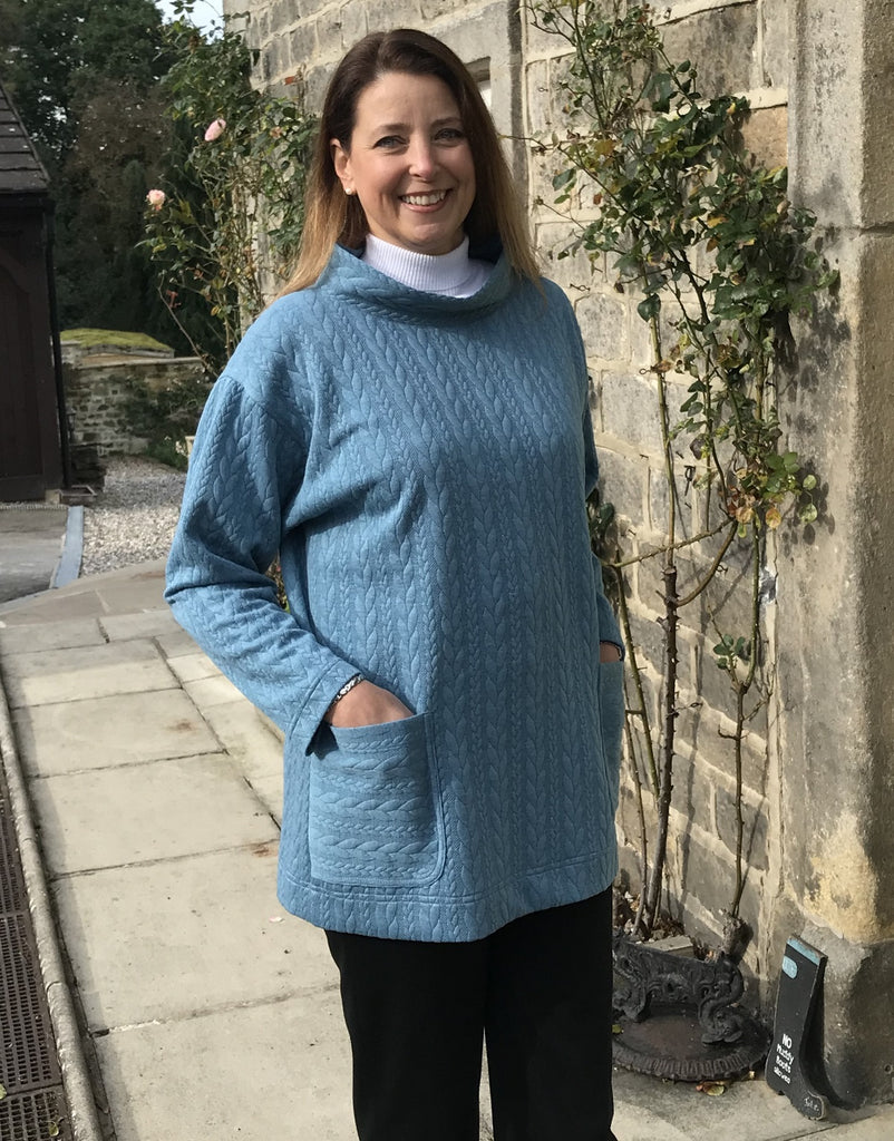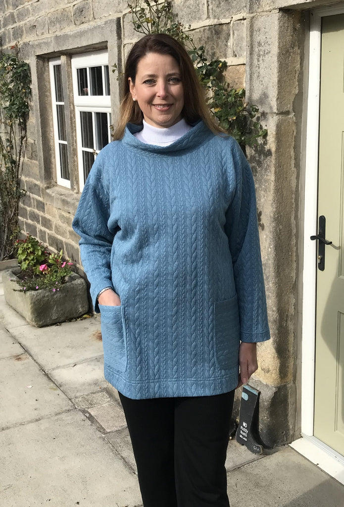 Another favourite shape which works so well in this new Stretch Cable knit fabric. It comes in three sizes which are very generous. It is an oblong shaped tunic style, no swing to the hips. It has a boat shaped neckline with a small stand collar which is wide enough to allow something to be worn underneath and patch pockets on the front.