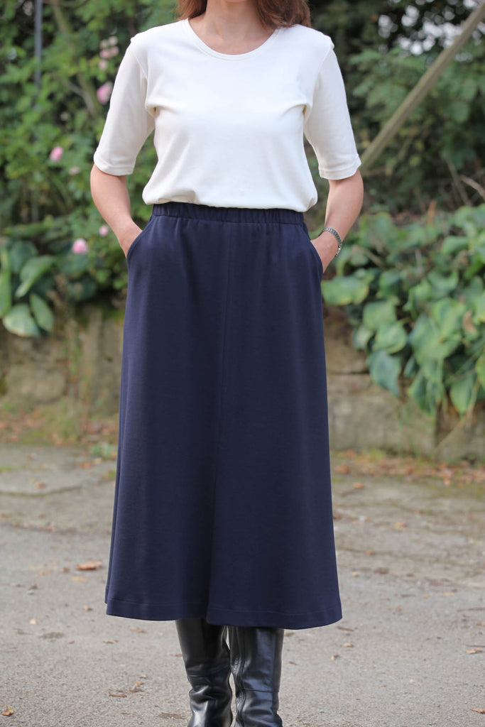 A four panel Jersey skirt which is softly flared at the hemline. It has all round waist elastication for easy fitting and has pockets. This skirt is fully lined with a knitted lining in natural colour.