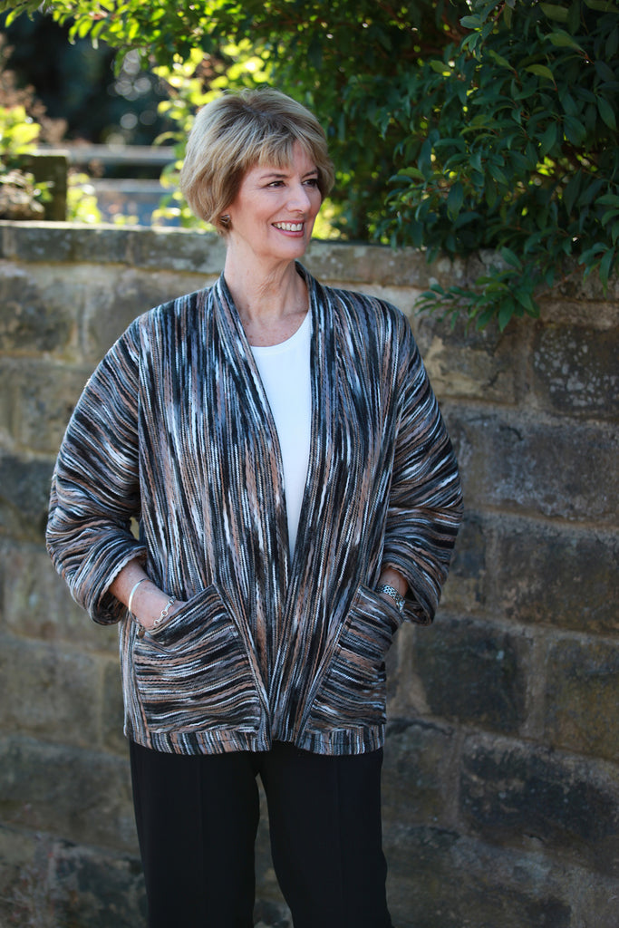Lovely shades of camel, stone and grey are used for our classic edge to edge Jacket with dolman sleeves and patch pockets. We love this fabulous fabric which has the appearance of multi coloured braids of wool.