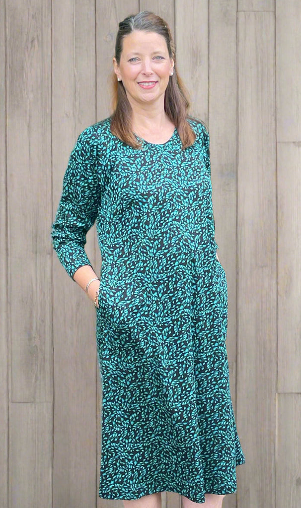 Our easy to wear weekender jersey dress in emerald on a black background. Such a flattering style with a scooped neckline and a separate matching infinity scarf. It is an A line shape with plenty of swing in the hips and hemline. It has long sleeves and pockets in the side seams. This dress is very generously sized.