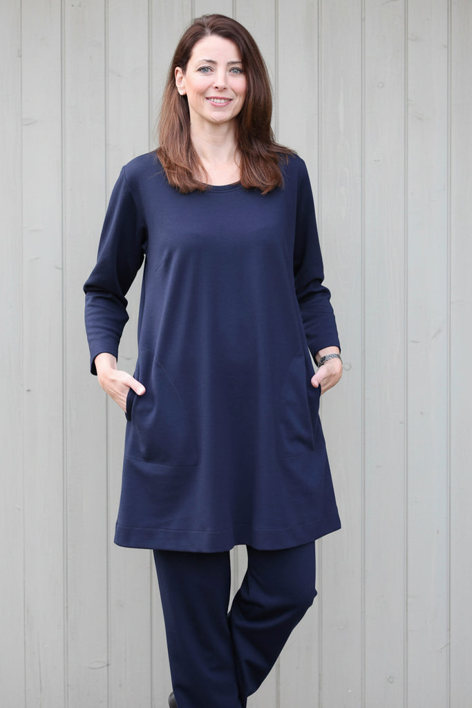 Our Weekender Jersey Dress which is great over our Cove jersey trousers. It has long sleeves and a scooped neckline shown in navy or a cowl neckline shown. There are pockets in the side seams.