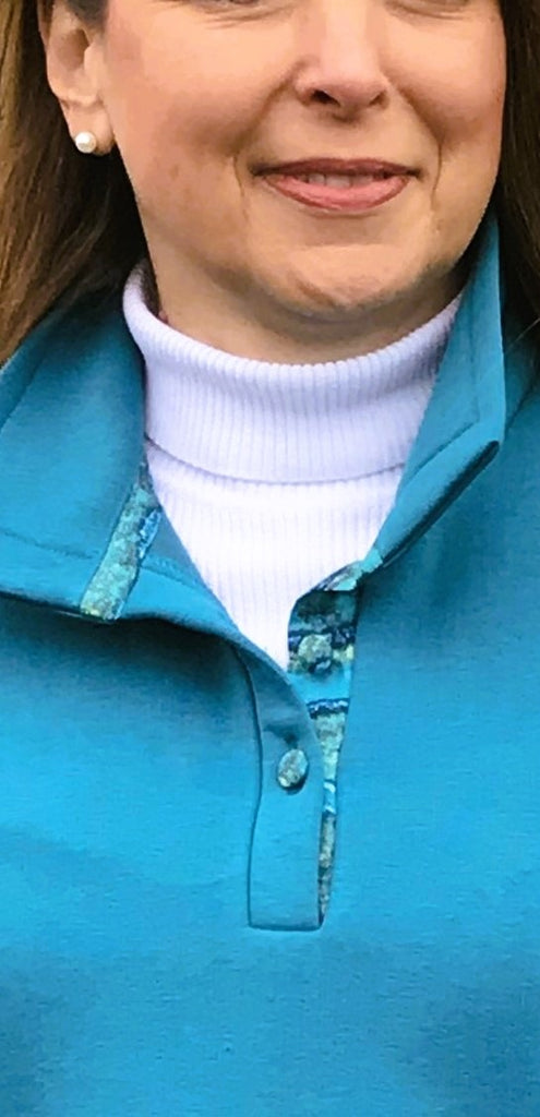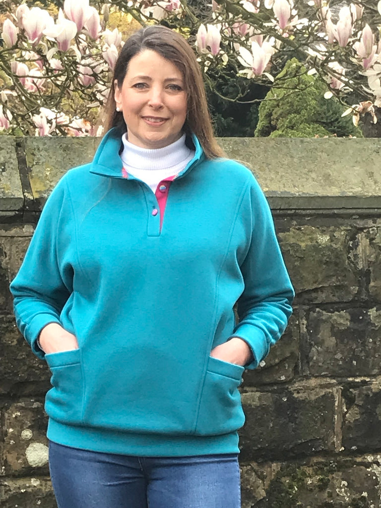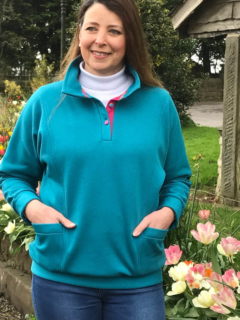 This attractive easy to wear Sweatshirt/Leisure Top has deep dolman sleeves and two front pockets. It has a collar and a floral print covered button fastening. With a loose hip band it is a very flattering shape. It comes in this lovely rich teal colour and is available with two different trims.