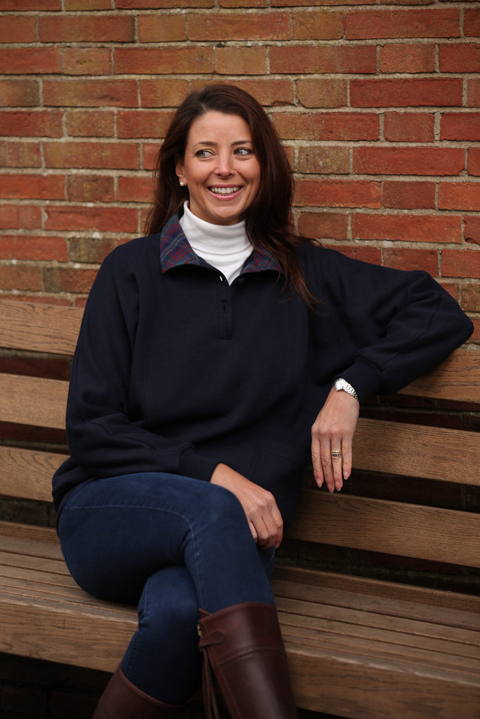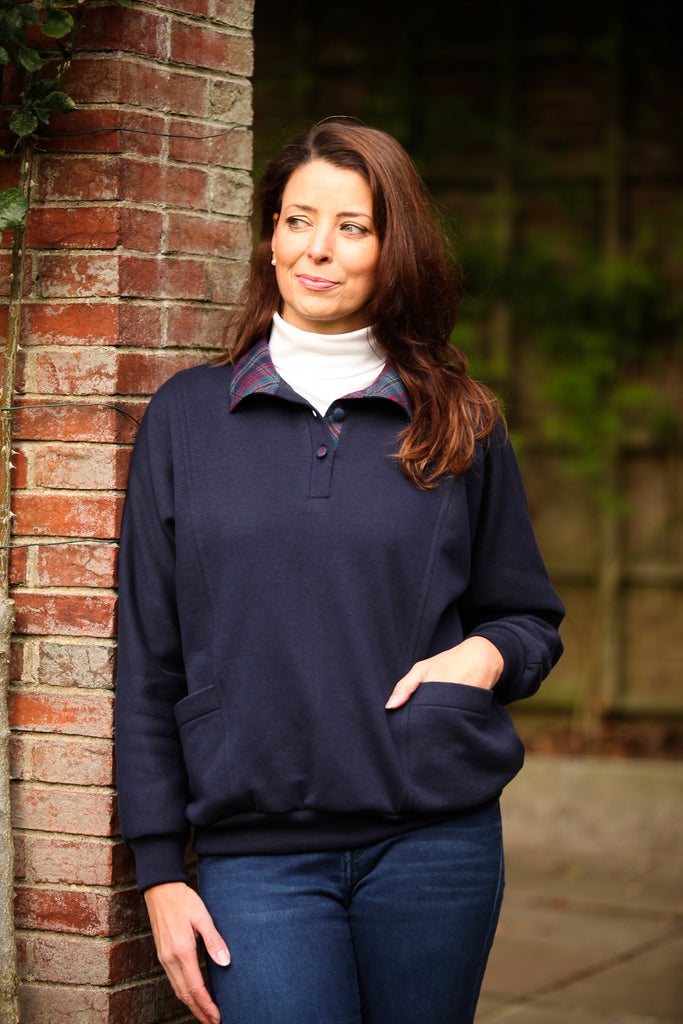 This easy to wear sweatshirt has dolman sleeves and two deep pockets. It has a soft collar in brushed cotton check and a two button fastening. It also has a loose hip band.