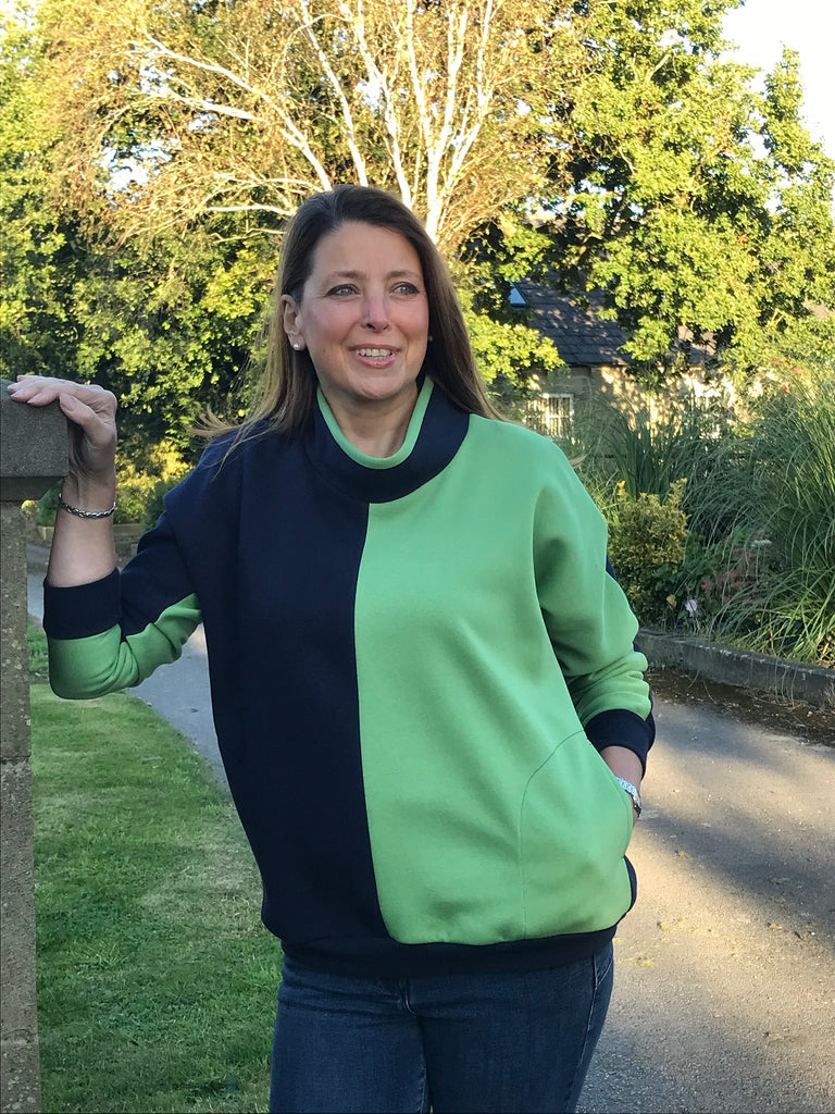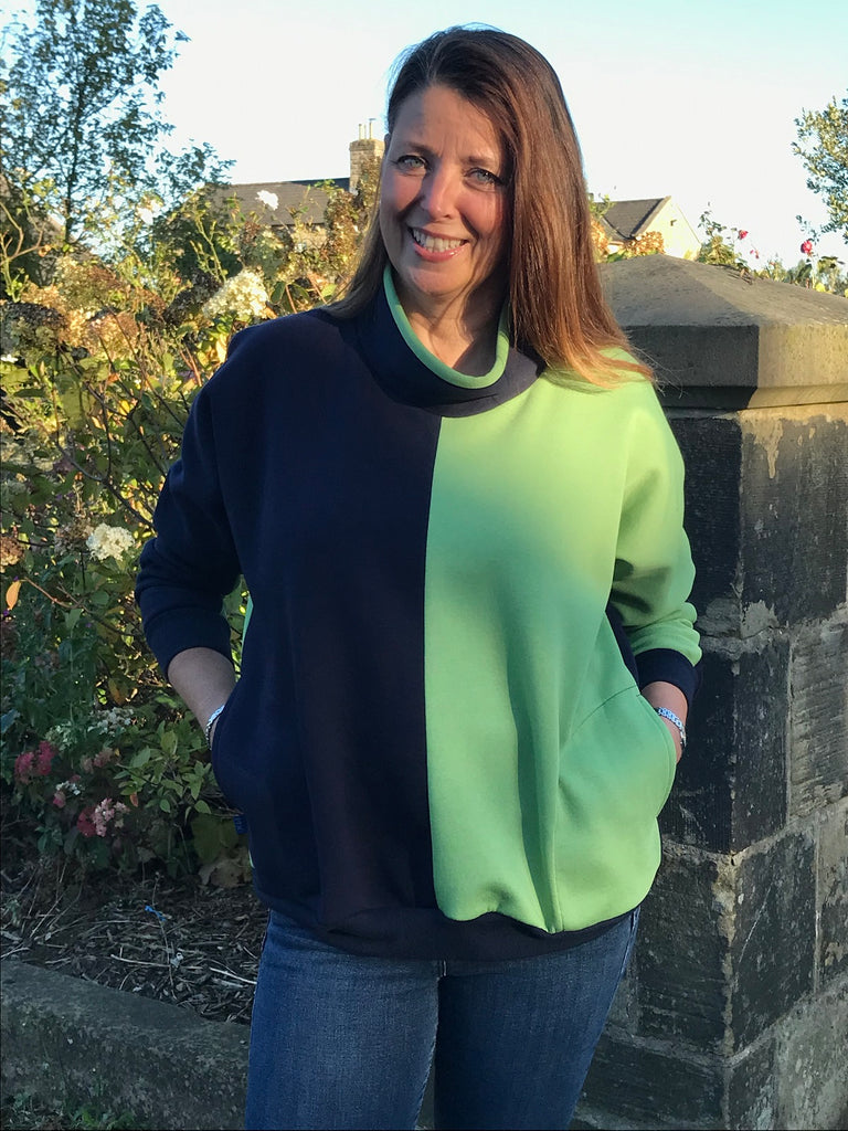 A new addition to our favourite two colour tops. A very generous fitting smart but casual sweatshirt top. It has deep dolman sleeves which have cuffs and it has a loose band around the hip. It is in contrasting colours on the front and back with an attractive small cowl neckline also in two colours. It has discreet pockets in the side seams. Looks good with jeans trousers or a skirt.
