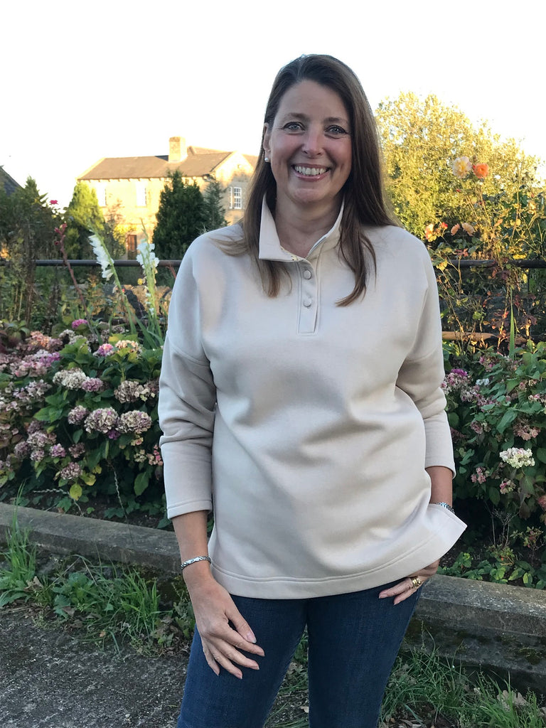 A classic tunic shaped Leisure top in a lovely soft sweatshirt fabric. It has semi batwing long sleeves which gives plenty of room over the bust. It has a small stand collar with a neat floral trim and is fastened with two self covered buttons. It also features small side splits.