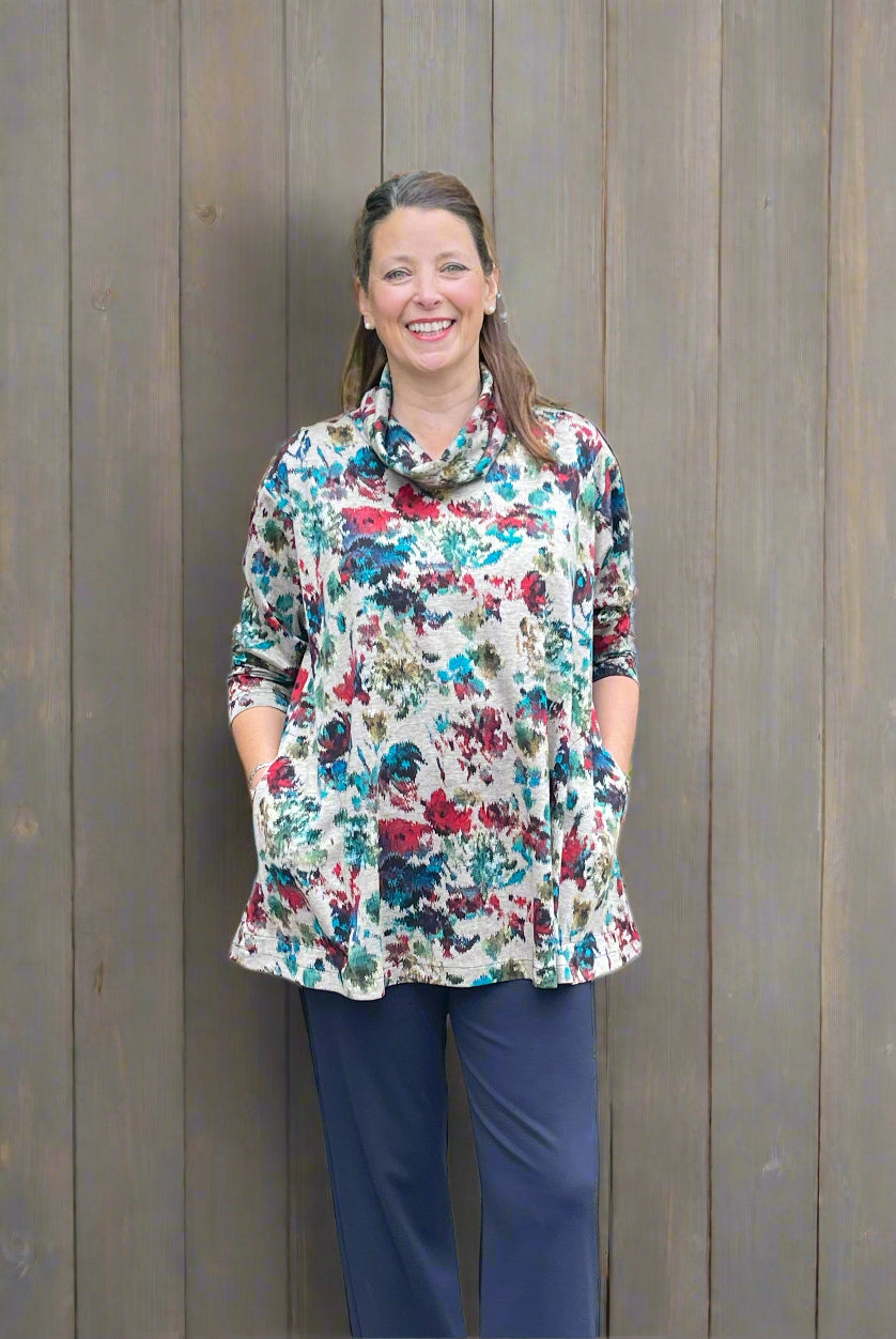 We love this tapestry look print on a soft handle jersey fabric which doesn't crease. Long sleeves and plenty of swing to the hips. It has a loose floppy cowl neckline and has pockets in the side seams. It is a generously sized garment.