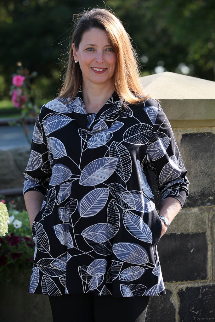 One of our favourite long A line top with plenty of swing to the hips. It comes in a soft Viscose Lycra knit and has a deep loose cowl neckline which sits away from the neck. It also has pockets in the side seams. This is a generously sized garment. Our model is a size 14 and is wearing the 12/14