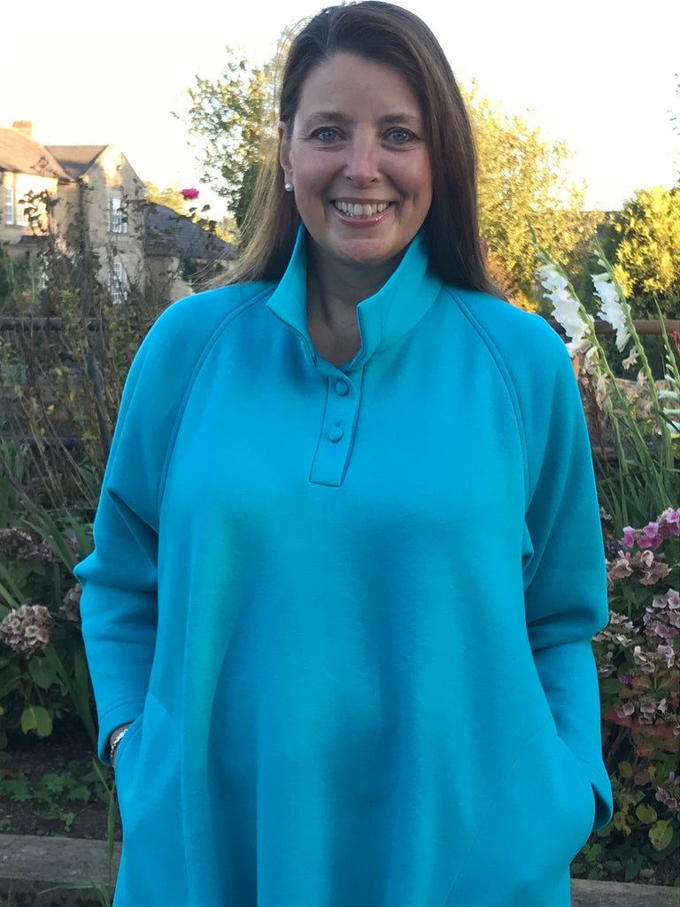 Our favourite swing shape with a front neck opening and featuring a collar and button stand.  It is brushed on the inside so it is cosy and is roomy enough to wear something underneath. There are pockets in the side seams and is fastened with small studs