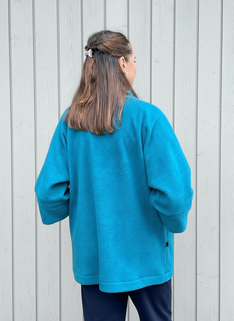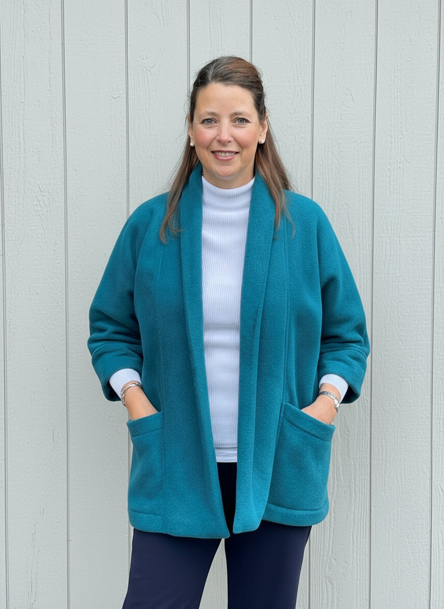One of our favourite Jackets and with the option of a long straight sleeve which can be turned back or the original 3/4 sleeves version which we are continually asked to bring back. An unusual shape and a very useful jacket. Wear it inside for an extra layer or out doors on a warmer autumn day. It is edge to edge and has two deep pockets.