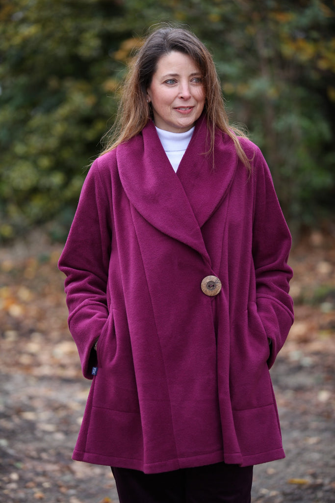 Our favourite fleece Coat. An elegant coat which has a deep shawl collar, pockets in the side seams and has deep cuffs which can be turned back. It is fastened with one large button. It is a very generously sized garment.