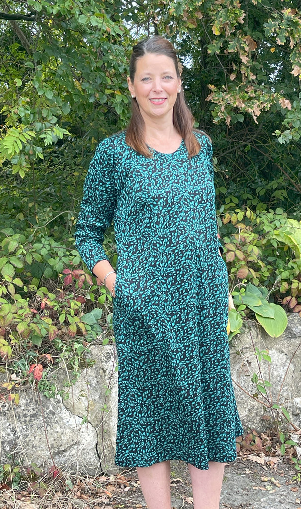 Our easy to wear weekender jersey dress in emerald on a black background. Such a flattering style with a scooped neckline and a separate matching infinity scarf. It is an A line shape with plenty of swing in the hips and hemline. It has long sleeves and pockets in the side seams. This dress is very generously sized.